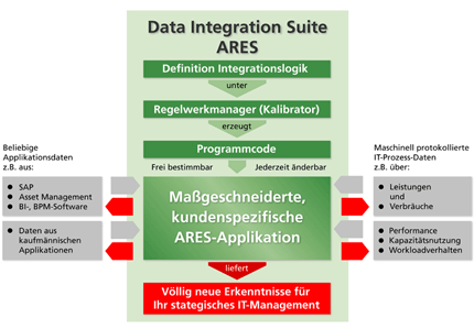 Mit dem integrativen Gesamtansatz der Data Integration Suite ARES, Analysis Retrieval and Evaluation System, hat COMLAB eine einzigartige Lösung entwickelt, die Ihre isolierten Dateninseln in Beziehung zueinander setzt und sie frei bestimmbar neu zusammenführt. Daraus ergibt sich ein zusammenhängendes, vergleichbares Datenmaterial, das Ihnen vollständig neue Erkenntnisse für Ihre strategische Investitionsplanung liefert. Darüber hinaus stellt die Data Integration Suite ARES, als zentrale Datenbasis, Informationen für alle Anforderungen von der Geschäftsprozess Überwachung, über das IT-Service Management bis zur qualitativen IT-Service Verrechnung zur Verfügung.
